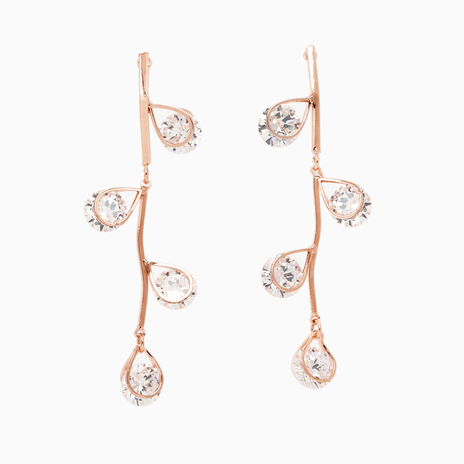 “Foliis Adamas” rose gold plated hinged drop earrings.  Set with full cut round brilliant cubic zirconia stones. Nickel and lead free.