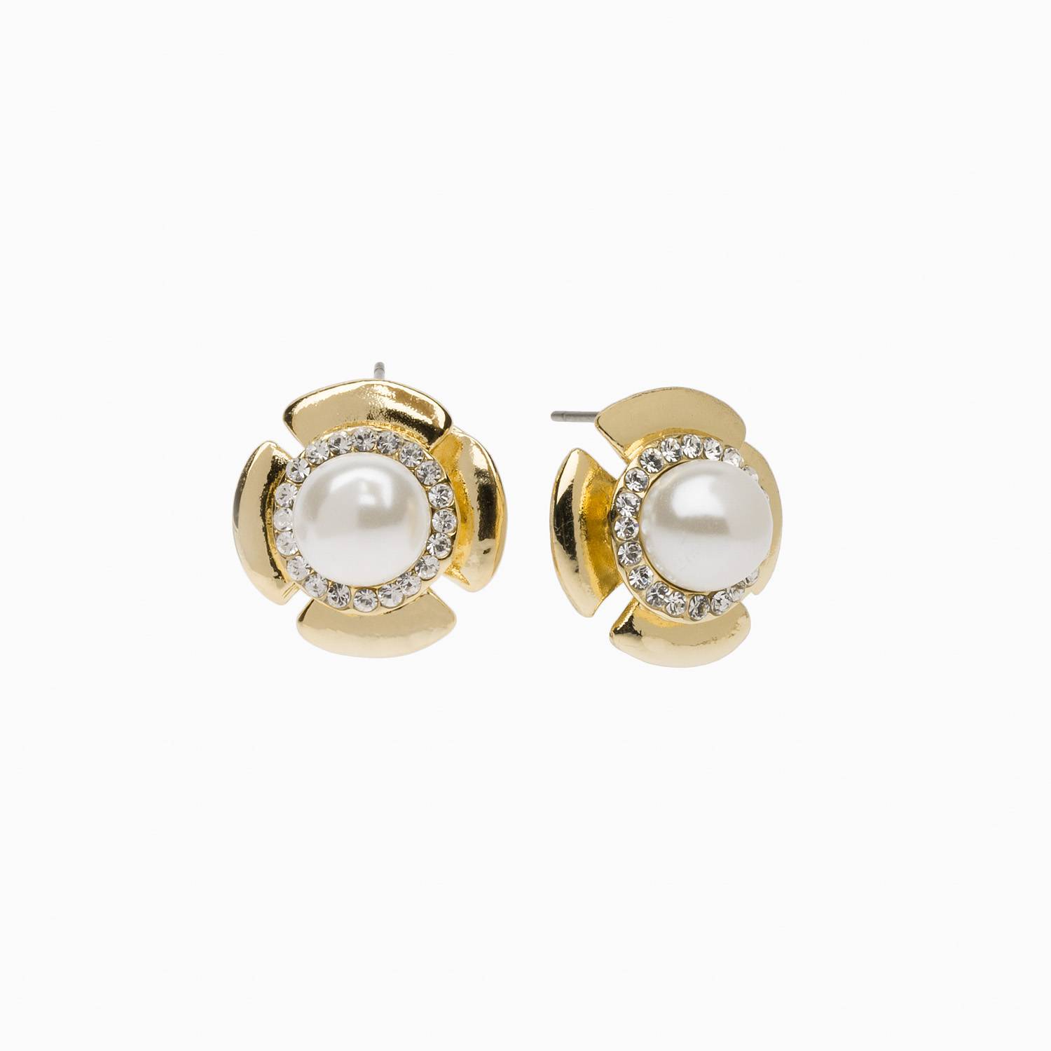 “Perla Fiore” yellow gold plated stud earrings. Set with cream faux pearl shell and accented with clear faceted round cut Stellux crystals. Nickel and lead free.