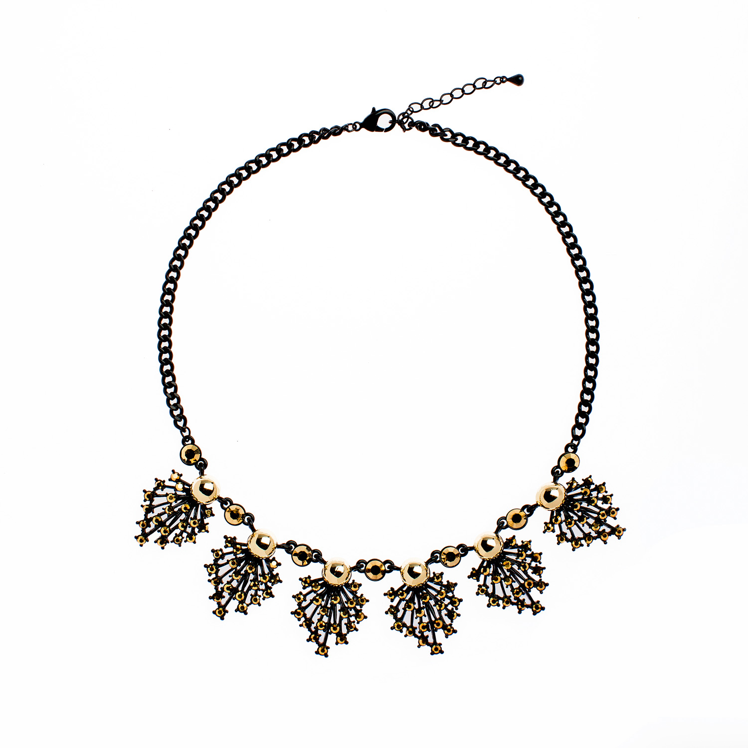 “Sultana” necklace finished in black rhodium plating, accented with aurum Preciosa faceted crystal and polished gold plated pearls. Features a lobster style clasp assembly with adjustable links. Nickel and lead free.