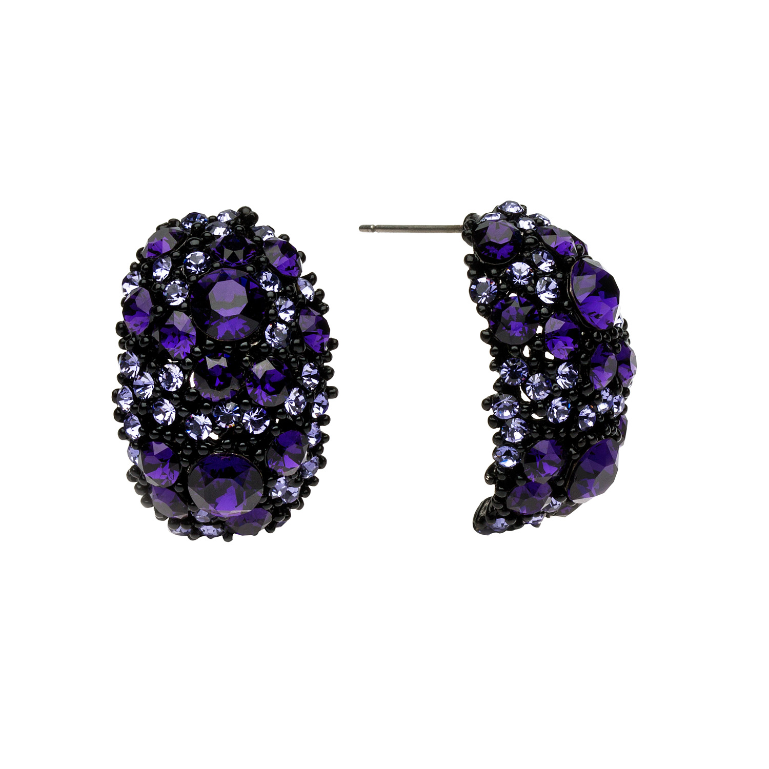 “Velluto Viola” huggy earrings finished in black rhodium, set with purple velvet Swarovski crystals. Nickel and lead free.
