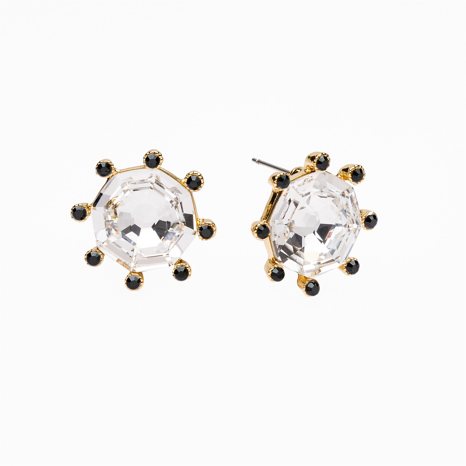 “VIII Columnas” yellow gold plated stud earrings with large faceted Swarovski crystal and individually bezel set hematite stones. Nickel and lead free.